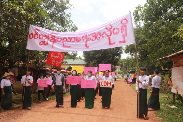 စစ်ကောင်စီ၏ အုပ်ချုပ်မှုအောက်တွင် ပညာရေးစနစ် အလိုမရှိဟု ယမန်နေ့ မေလ ၈ ရက် နှစ်အိမ်-ခလယ်စောရွာတွင်ပြုလုပ်သည့် စုပေါင်းဆန္ဒထုတ်ဖော်ပွဲတွင် ကျောင်းဆရာ/ဆရာမများက ကြွေးကြော်ခဲ့ကြသည်။