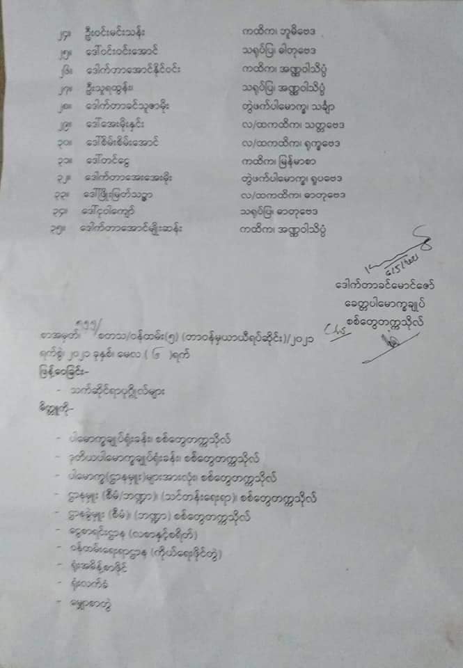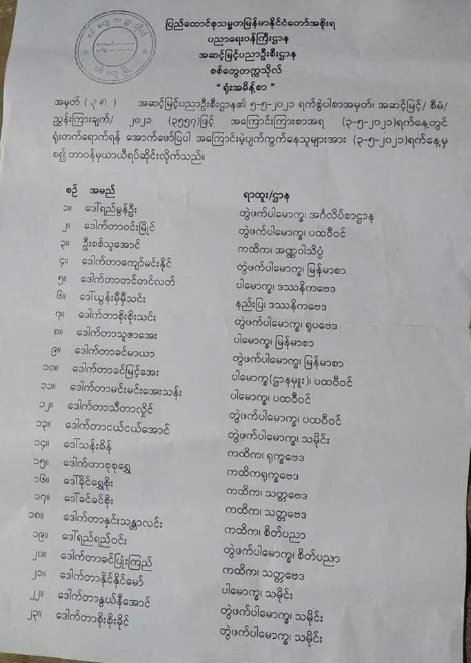 ယာယီ တာဝန်မှရပ်ဆိုင်းခံလိုက်ရသူများအထဲတွင် ဒေါ်ရည်မွန်ဦး (တွဲဖက်ပါမောက္ခ၊ အင်္ဂလိပ်စာဌာန)၊ ဒေါက်တာဝင်းမြိုင် (တွဲဖက်ပါမောက္ခ၊ ပထဝီဝင်)၊ ဦးစစ်သူအောင် (ကထိက၊ အဏ္ဍဝါသိပ္ပံ)၊ ဒေါက်တာ ကျော်မင်းနိုင် (တွဲဖက်ပါမောက္ခ၊ မြန်မာစာ)၊ ဒေါက်တာတင်တင်လတ် (ပါမောက္ခ၊ ဒဿနိက)၊ ဒေါ်ယွန်းမှီမှီသင်း (နည်းပြ၊ဒဿနိက)၊ ဒေါက်တာစိုးစိုးသင်း (တွဲဖက်ပါမောက္ခ၊ ရူပဗေဒ)၊ ဒေါက်တာသူဇာအေး (ပါမောက္ခ၊ မြန်မာစာ)၊ ဒေါက်တာခင်မာယာ (တွဲဖက်ပါမောက္ခ၊ မြန်မာစာ)၊ ဒေါက်တာခင်မြင့်အေး (ပါမောက္ခ (ဌာနမှူး)၊ ပထဝီဝင်) စသည့် ဆရာ/ဆရာမများ အပါအဝင် ၃၅ ဦးဖြစ်သည်။