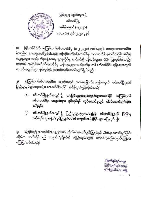 မင်းတပ်မြို့နယ်အတွင်းရှိ ပြည်သူလူထုများအနေဖြင့် မင်းတပ်မြို့နယ် ပြည်သူ့အုပ်ချုပ်ရေးအဖွဲ့၏ ခွင့်ပြုချက်မပါဘဲ ကျောင်းအပ်နှံခြင်းမပြုလုပ်ရန်နှင့် လိုက်နာခြင်းမရှိပါက သက်ဆိုင်သည့် ကျောင်း/ပုဂ္ဂိုလ်၏ လုံခြုံရေးအတွက် တာဝန်ယူမည်မဟုတ်ကြောင်း မင်းတပ်မြို့ ပြည်သူ့အုပ်ချုပ်ရေးအဖွဲ့၏ ထုတ်ပြန်ချက်တွင် ဖော်ပြထားသည်။
