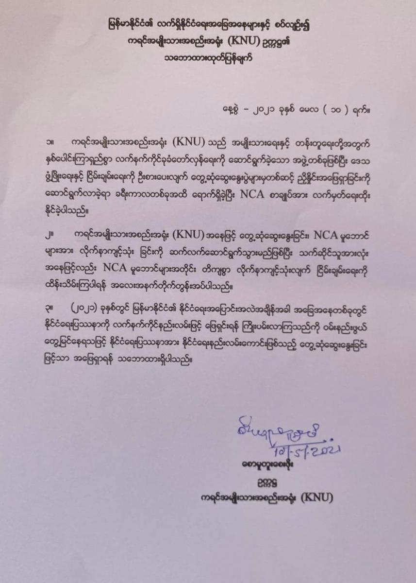 KNU အနေဖြင့် တွေ့ဆုံဆွေးနွေးခြင်း၊ NCA မူဘောင်များအား လိုက်နာကျင့်သုံးခြင်းကို ဆက်လက်ဆောင်ရွက်သွားမည်ဖြစ်ပြီး သက်ဆိုင်သူများအားလုံးအနေဖြင့်လည်း NCA မူဘောင်အတိုင်း လိုက်နာကျင့်သုံးကြပြီး ငြိမ်းချမ်းရေးကိုထိန်းသိမ်းကြရန် တိုက်တွန်းထားသည်။