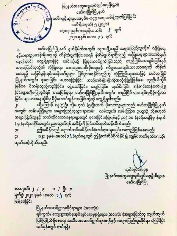 ရန်ကုန်မြို့တွင် ပြီးခဲသည့်တစ်ပတ်ကမှ ညမထွက်ရအမိန့်ကို ပြောင်းလဲသတ်မှတ်ခဲ့တာဖြစ်ပြီး ယခုအခါတွင် မော်လမြိုင်မြို့ကို အချိန်ပြောင်းလဲ သတ်မှတ်ခဲ့ခြင်းဖြစ်သည်။