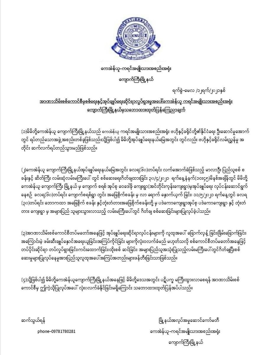 မိမိဒေသအတွင်း ပဋိပက္ခများ မကြီးပွားစေရေးအတွက် အာဏာသိမ်းစစ်ကောင်စီ၏ ယခုလို လုပ်ဆောင်ချက်များကို လုံးဝ လက်ခံနိုင်ခြင်းမရှိသလို ကျောက်ကြီးမြို့နယ်အနေဖြင့် KNU ဗဟိုနှင့် ခရိုင်တို့၏ ဦးဆောင်မှုအောက်တွင် ရပ်တည်သောအဖွဲ့ဖြစ်သည့်အတွက် အုပ်ချုပ်ရေးကိစ္စနှင့်ပတ်သက်၍ ဗဟိုနှင့် ခရိုင်လမ်းညွှန်မှုအတိုင်း ဆက်လက်ရပ်သည်သွားမည်ဖြစ်ကြောင်းလည်း ထုတ်ပြန်ထားသည်။