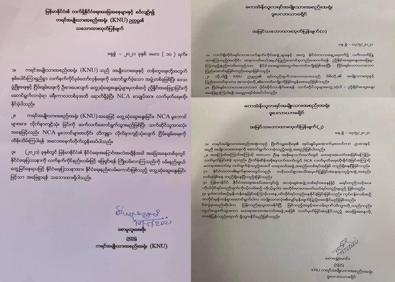 KNU ဥက္ကဋ္ဌ ၏ မေလ ၁၀ ရက်နေ့ ထုတ်ပြန်ချက်ထဲတွင် ကရင်အမျိုးသားအစည်းအရုံး KNU အနေဖြင့် တွေ့ဆုံဆွေးနွေးခြင်း၊ NCA မူဘောင်များအား လိုက်ကျင့်သုံးခြင်းကို ဆက်လက်ဆောင်ရွက်သွားမည်ဖြစ်ပြီး သက်ဆိုင်သူအားလုံးအနေဖြင့်လည်း NCA မူဘောင်များအတိုင်း တိကျလိုက်နာကျင့်သုံးလျက် ငြိမ်းချမ်းရေးကို ထိန်းသိမ်းကြပါရန် အလေးအနက် တိုက်တွန်းအပ်ပါသည်ဟု ပါရှိသည်။