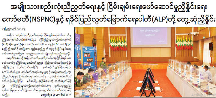 နစကစစ်ကောင်စီဖွဲ့စည်းထားသည့် အမျိုးသားစည်းလုံးညီညွတ်ရေးနှင့် ငြိမ်းချမ်းရေးဖော်ဆောင်မှု ညှိနှိုင်းရေးကော်မတီ NSPNC နှင့် NCA လက်မှတ်ရေးထိုးထားသည့် ရခိုင်ပြည်လွတ်မြောက်ရေးပါတီ ALP တို့ မေလ ၁၃ ရက်က နေပြည်တော်တွင် တွေ့ဆုံဆွေးနွေးခဲ့သည်ဟု သိရသည်။