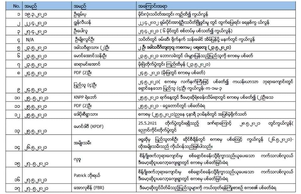 မတ်လ ၁၉ ရက်နေ့မှ မေလ ၃၁ ရက်နေ့အထိ အကြမ်းဖက်စစ်ကောင်စီကို ခုခံတိုက်ခိုက်ခြင်း၊ သပိတ်မှောက်ခြင်းကြောင့် ကျဆုံးသွားတဲ့တော်လှန်ရေးသမားတွေနဲ့ အပြစ်မဲ့ပြည်သူတွေ စုစုပေါင်း (၃၁) ဦး ကျဆုံးခဲ့တယ်လို့ KNDF ရဲ့ ထုတ်ပြန်ချက်အရ သိရပါတယ်။