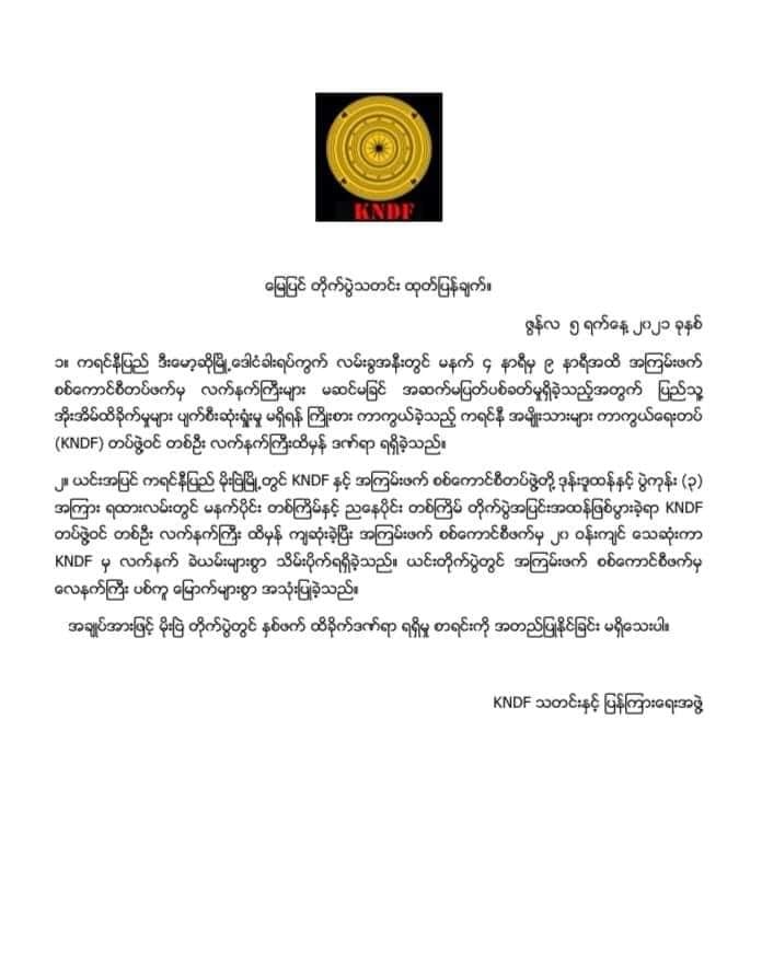 ဒီကနေ့ ဇွန်လ ၅ရက်နေ့ ရှမ်း-ကရင်နီနယ်စပ် မိုးဗြဲတိုက်ပွဲမှာ မိုးဗြဲ PDF နဲ့ အကြမ်းဖက်စစ်ကောင်စီတပ်တို့ တိုက်ပွဲဖြစ်ပွားခဲ့ပြီး စစ်ကောင်စီတပ်က ၂၀ ဝန်းကျင်သေဆုံးသလို လက်နက်ခဲယမ်းများရရှိခဲ့တယ်လို့ ကရင်နီအမျိုးသားကာကွယ်ရေးတပ် (KNDF) သတင်းနှင့်ပြန်ကြားရေးက သတင်းထုတ်ပြန်ပါတယ်။