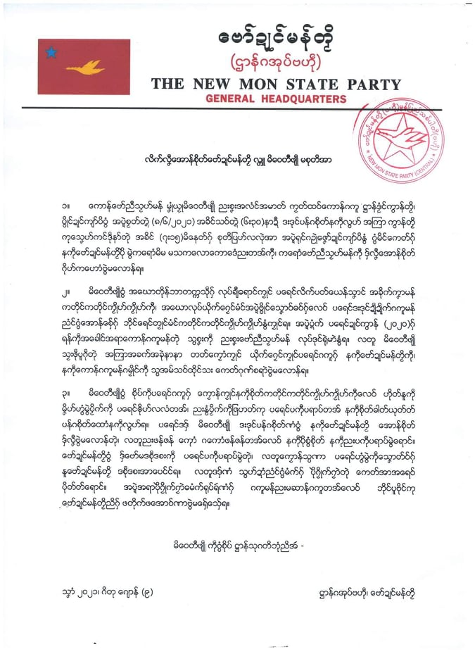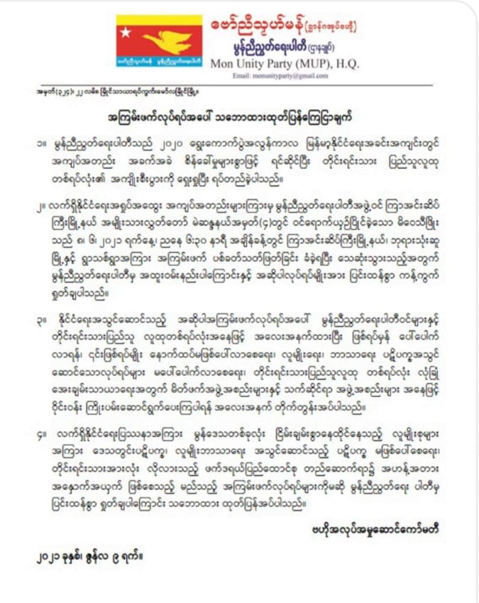 လက်ရှိ နိုင်ငံရေးပြဿနာအကြား မွန်ဒေသတစ်ခုလုံး ငြိမ်းချမ်းစွာနေထိုင်နေသည့် လူမျိုးစုများအကြား ဒေသတွင်းပဋိပက္ခ၊ လူမျိုးဘာသာရေး အသွင်ဆောင်သည့် ပဋိပက္ခမဖြစ်ပေါ်စေရေး၊ တိုင်းရင်းသားအားလုံး လိုလားသည့် ဖက်ဒရယ်ပြည်ထောင်စု တည်ဆောက်ရာ၌ အဟန့်အတားအနှောက်အယှက်ဖြစ်စေသည့် မည်သည့် အကြမ်းဖက်လုပ်ရပ်မျိုးကမဆို မွန်ညီညွတ်ရေးပါတီမှ ပြင်းထန်စွာရှုတ်ချကြောင်း ထုတ်ပြန်ထားသည်။
