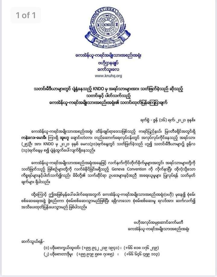 KNU အနေဖြင့် လက်နက်ကိုင်တိုက်ခိုက်မှုများအတွင်း အရပ်သားများကို သတ်ဖြတ်သည့်ဖြစ်စဉ်တို့ကို လက်ခံနိုင်ခြင်းမရှိသည့် Geneva Convention ကို လိုက်နာသည့်အဖွဲ့ဖြစ်ကြောင်း ထုတ်ပြန်ခဲ့သည်။