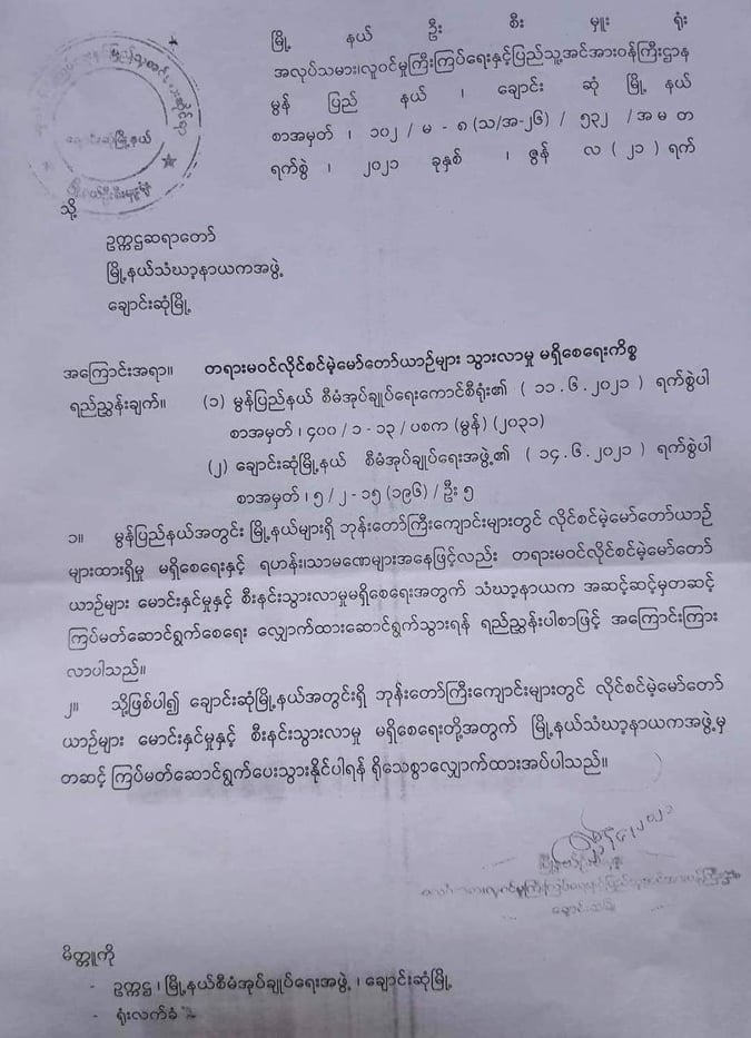 တရားမဝင်လိုင်စင်မဲ့ မော်တော်ယာဉ်များ သွားလာမှုမရှိစေရေးကိစ္စနှင့်ဆက်စပ်၍ အလုပ်သမားလူဝင်မှုကြီးကြပ်ရေးနှင့် ပြည်သူ့အင်အားဝန်ကြီးဌာနက ချောင်းဆုံမြို့နယ် သံဃာနာယကအဖွဲ့ထံ အကြောင်းကြားစာတစ်စောင် လူမှုကွန်ယက်ပေါ် ပြန့်နှံ့ထွက်ပေါ်လာပြီးနောက် လိုင်စင်မဲ့မော်တော်ယာဉ်များကို စစ်ကောင်စီက မကြာမီဖမ်းဆီးလာနိုင်ကြောင်း မော်လမြိုင်မြို့ ကားအရောင်းအဝယ်လောကတွင် ယူဆပြောဆိုနေကြသည်။