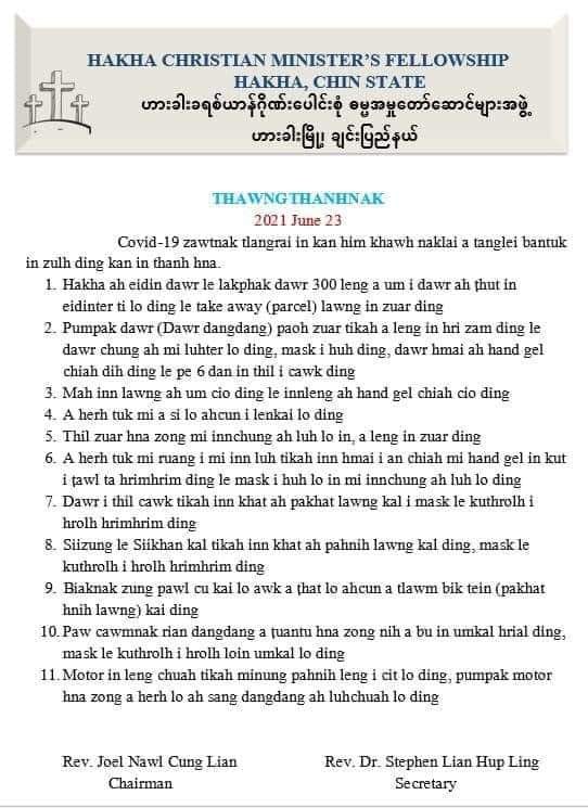 ဟားခါးမြို့တွင် ကိုဗစ်-၁၉ ရောဂါ ကူးစက်ပျံ့နှံ့မှုရှိလာသောကြောင့် ဟားခါးခရစ်ယာန်ဂိုဏ်းပေါင်းစုံအဖွဲ့မှ ကိုဗစ်ကာကွယ်ရေးအတွက် ယနေ့ (၂၃.၆.၂၀၂၁) ရက်တွင် ကိုဗစ်သတိပေးထုတ်ပြန်ချက် ၁၁ ချက် ထုတ်ပြန်ထားကြောင်း သိရသည်။