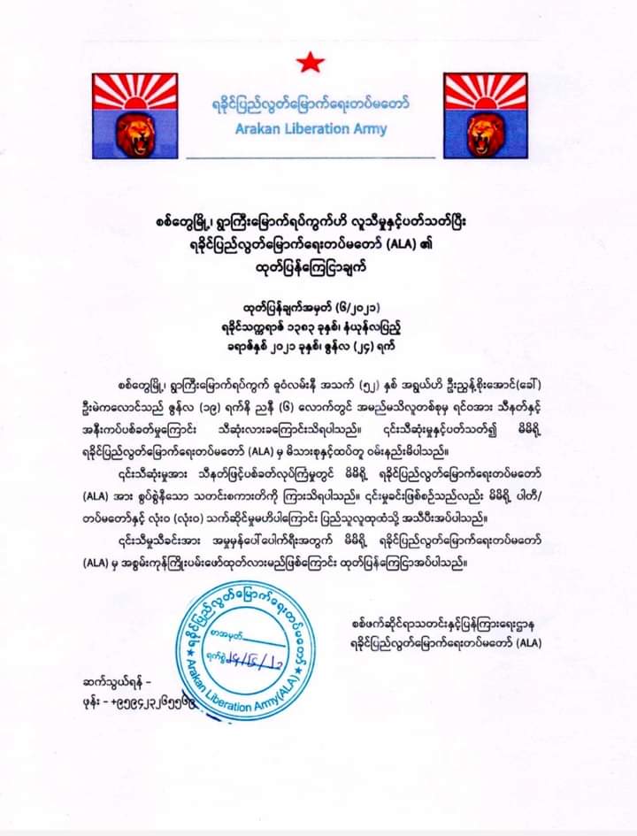 ပြီးခဲ့သည့် ဇွန်လ ၁၉ ရက်နေ့က စစ်တွေမြို့ပေါ်ရှိ ရွာကြီးမြောက်ရပ်ကွက်တွင် အရပ်သားမှာ လက်သမားဆရာတစ်ဦးဖြစ်ပြီး အသက် (၅၂) နှစ်အရွယ်ရှိ ဦးညွှန့်စိုးအောင် (ခ) ဦးမဲကလောင် ပစ်သတ်ခံရ၍ သေဆုံးမှုတွင် ALA အား စွပ်စွဲမှုများထွက်ပေါ်နေကြောင်း၊ ယင်းလုပ်ကြံမှုမှာ မိမိတို့နှင့် လုံး၀ သက်ဆိုင်မှုမရှိကြောင်း ၎င်းထုတ်ပြန်ချက်တွင် ဖော်ပြထားသည်။
