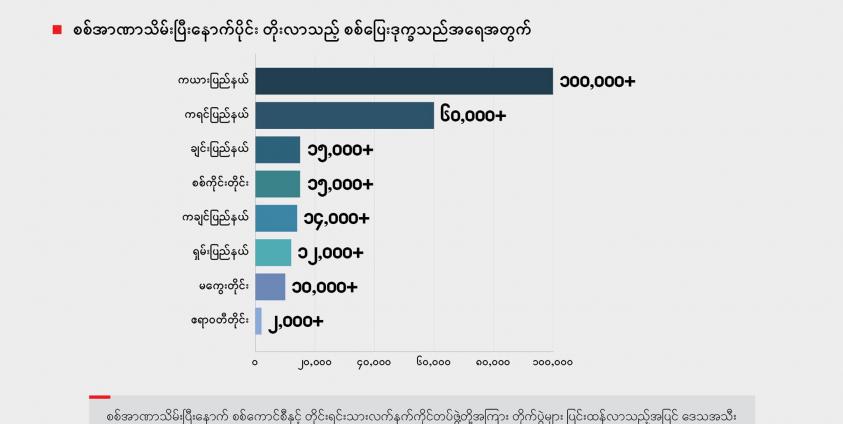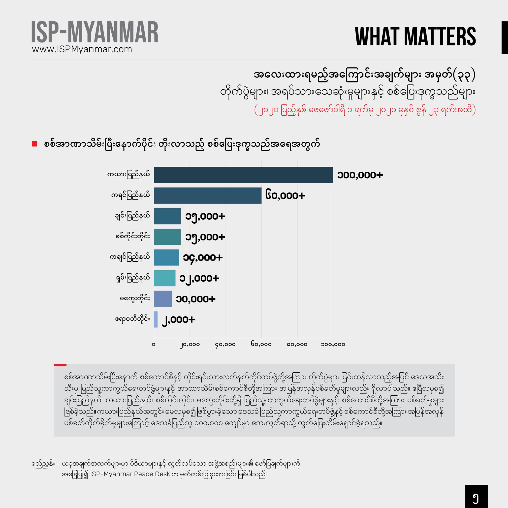 “၂၀၂၀ ပြည့်နှစ်ကစပြီး အခု ၂၀၂၁ ခုနှစ် ဇွန် တတိယပတ်ကာလအထိ စစ်ပြေးဒုက္ခသည် အရေအတွက်ကိုကြည့်ရင် ၇၂၅,၅၀၀ ဦးကျော်ရှိလာခဲ့ပါတယ်။ တိုးလာတဲ့ စစ်ပြေးဒုက္ခသည်တွေအနက် ၁၀၀,၀၀၀ ကျော်ဟာ ကယားပြည်နယ်အတွင်း အာဏာသိမ်းစစ်ကောင်စီနဲ့ ဒေသခံ ပြည်သူ့ကာကွယ်ရေးတပ်ဖွဲ့တွေအကြား အပြန်အလှန် ပစ်ခတ်တိုက်ခိုက်မှုများအပြီး ဘေးလွတ်ရာကို တိမ်းရှောင်လာကြတာပဲဖြစ်ပါတယ်။ ဒါက ကယားပြည်နယ်အတွင်း ရှိနေသူတွေထဲက သုံးပုံတပုံကျော်ဟာ စစ်ပြေးဒုက္ခသည် ဖြစ်လာကြတာဖြစ်ပါတယ်။ အလားတူ ပစ်ခတ်တိုက်ခိုက်မှုတွေကြောင့် ချင်းပြည်နယ်မှာ စစ်ပြေးဒုက္ခသည် ၁၅,၀၀၀ ကျော်၊ စစ်ကိုင်းတိုင်းမှာ ၁၅,၀၀၀ ကျော်၊ မကွေးတိုင်းမှာ ၁၀,၀၀၀ ကျော်နဲ့ ဧရာဝတီတိုင်းမှာ ၂,၀၀၀ ကျော်အထိ အသီးသီးရှိလာခဲ့ပါတယ်” ဟု ISP-Myanmar က ပြောသည်။