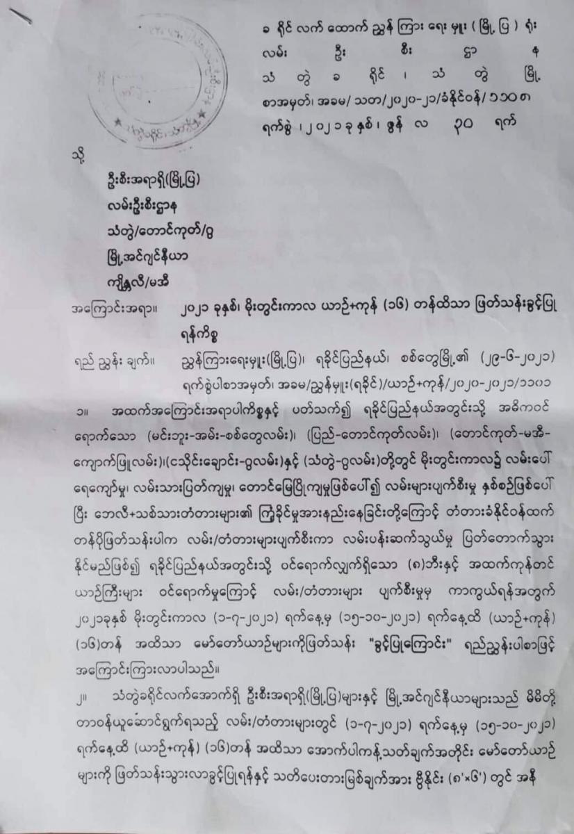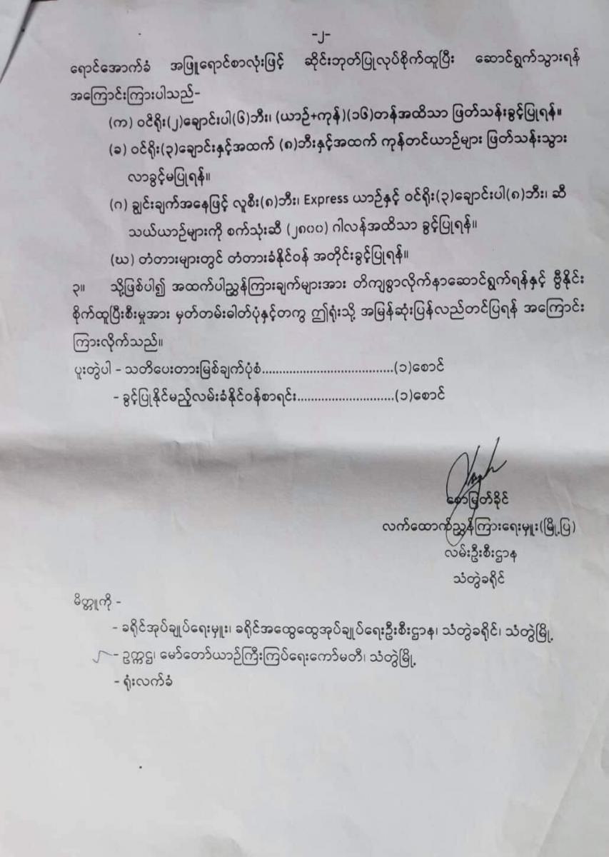 ထို့ကြောင့် ရခိုင်ပြည်နယ်အတွင်းသို့ ဝင်ရောက်လျှက်ရှိသော (၈) ဘီးနှင့်အထက် ကုန်တင်ယာဉ်ကြီးများ ဝင်ရောက်မှုကြောင့် လမ်း/တံတားများ ပျက်စီးမှုမှ ကာကွယ်နိုင်ရန် ယာဉ်+ကုန် (၁၆) တန်အထိသာ မော်တော်ယာဉ်များကို ဇူလိုင်လ ၁ ရက်နေ့မှ အောက်တိုဘာလ ၁၅ ရက်နေ့ထိ ဖြတ်သန်းသွားလာခွင့်ပြုကြောင်း ရည်ညွှန်းပါစာဖြင့် ညွှန်ကြားရေးမှူး (မြို့ပြ)၊ ရခိုင်ပြည်နယ်၊ စစ်တွေမြို့၏ (၂၉- ၆-၂၀၂၁) ရက်စွဲပါစာအမှတ်၊ အခမ/ ညွှန်မှူး (ရခိုင်)/ ယာဉ်+ကုန်/ ၂၀၂၀-၂၀၂၁/ ၁၁၀၁ ဖြင့် အကြောင်းကြားလာကြောင်း ကြေညာချက်တွင် ဖော်ပြသည်။