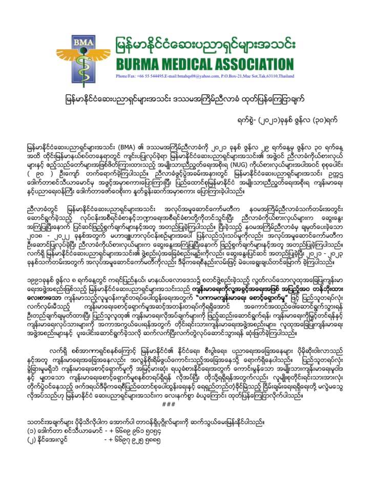 စစ်အာဏာရှင်စနစ်ကြောင့် မြန်မာနိုင်ငံတွင်းရှိ ကျန်းမာရေးစောင့်ရှောက်မှု အခြေအနေအပါအဝင် နိုင်ငံရေး၊ စီးပွားရေး၊ ပညာရေးအခြေအနေမှာလည်း အဆိုးဝါးဆုံးဖြစ်နေပြီး မျှတသော ကျန်းမာရေးစောင့်ရှောက်မှုစနစ် ရှိရန်လိုအပ်ဟု မြန်မာနိုင်ငံဆေးပညာရှင်အသင်း၏ ဒဿမအကြိမ်ညီလာခံမှ ထုတ်ပြန်လိုက်သည်။
