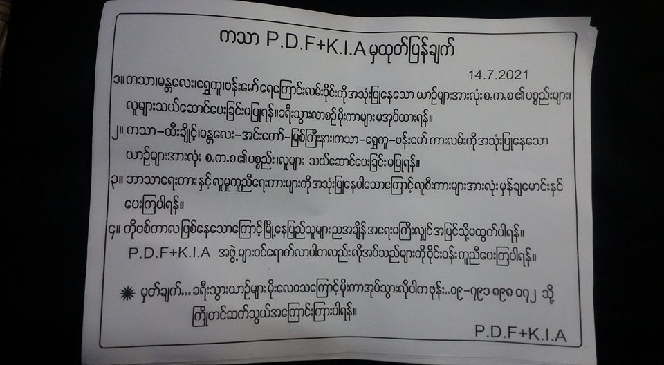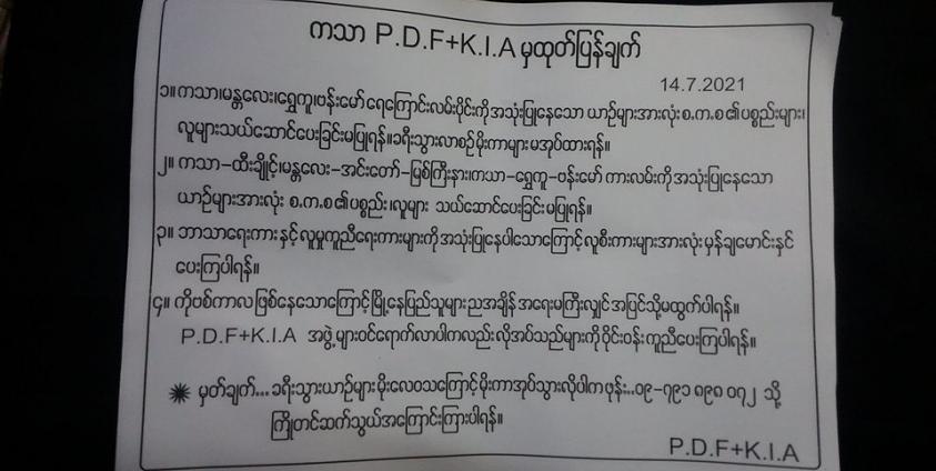 ကသာ-ဗန်းမော် ရေလမ်းကုန်းလမ်းသွားလာသူများ စစ်ကောင်စီနှင့်ပတ်သက်သည့် လူနှင့်ပစ္စည်းများ တင်ဆောင်ခြင်းမပြုရန်၊ မိုးကာများအုပ်ပြီး မမောင်းရန် ကသာ ပြည်သူ့ကာကွယ်ရေးတပ်ဖွဲ့ PDF နှင့် ကချင်လွတ်လပ်ရေးတပ်မတော် KIA တို့က သတိပေးထားသည်။
