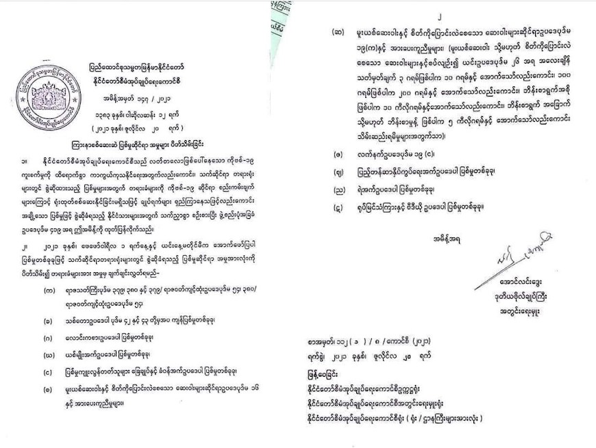 စစ်အာဏာသိမ်းသည့် ဖေဖော်ဝါရီလ ၁ ရက်နေ့နှင့် ယင်းနေ့မတိုင်မီက တရားစွဲထားသည့် ရာဇဝတ်မှုပုဒ်မ အမျိုးအစားအချို့တို့ဖြင့် ကြားနာစစ်ဆေးဆဲ ပြစ်မှုဆိုင်ရာအမှုများကို ပိတ်သိမ်းကြောင်း ဇူလိုင်လ ၂၀ ရက်နေ့က နိုင်ငံတော်စီမံအုပ်ချုပ်ရေးကောင်စီ-နစက ထုတ်ပြန်ကြေညာခဲ့ကြောင်း တွေ့ရသည်။