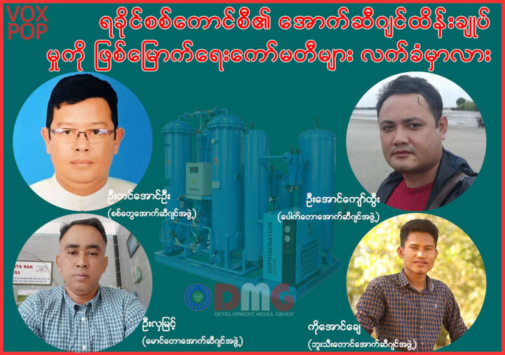 “ကျနော်တို့ စစ်တွေအဖွဲ့က အလှူငွေတွေနဲ့တည်ဆောက်နေတဲ့ စက်ရုံဖြစ်တဲ့အတွက် လှူဒါန်းမယ်ဆိုတဲ့ နေရာမှာ တခုမှခွဲခွဲခြားခြားမရှိဘူး။လှူဒါန်းမယ်ဆိုရင် အားလုံးကိုကြိုဆိုပါတယ်။ ဒီစက်ရုံက အဓိက အောက်ဆီဂျင် လိုအပ်နေတဲ့လူနာတွေဆီ ရောက်ရှိစေချင်တဲ့ စေတနာတွေနဲ့ပဲ လုပ်ဆောင်ထားတာဖြစ်တယ်။ နောက်တစ်ခုက အောက်ဆီဂျင်ထွက်လာလို့ရှိရင် ပြည်နယ်ကောင်စီလုပ်ဆောင်မယ့် စာတွေကတော့ လူမှုကွန်ယက်တွေမှာအများကြီးမြင်ရတယ်။ တရားဝင်တော့ ကျနော်တို့သိရတာ မဟုတ်သေးဘူး။ အဲတာက ကောင်စီအနေနဲ့ ဘယ်လိုအခြေအနေကို လုပ်မလဲဆိုတာ စောင့်ကြည့်ရအုန်းမယ်။ ထွက်လာတဲ့အောက်ဆီဂျင် အားလုံးကို သူတို့ရဲ့ အောက်ဆီဂျင်ကော်မတီကိုပဲ အပ်ရမှာလား၊ ဒါမှမဟုတ် စာရင်းပဲပို့ပြီးတော့ ကောင်စီကနေ စီမံခန့်ခွဲမှုလုပ်ဖို့တာလားဆိုက ကွဲကွဲပြားပြားတစ်ခုလည်း မသိရတဲ့အခါမှာတော့ ကျနော်တို့အနေနဲ့ ပြောရမှာ နည်းနည်းခက်တယ်။ စစ်တွေ Oxygen Plant အနေနဲ့ စောင့်ကြည့်နေဆဲအခြေအနေဖြစ်တယ်။ ဒါပေမယ့် စက်ရုံတည်ဆောက်ရေးကိုတော့ အယင်အတိုင်းပဲ ရှေ့ကိုဆက်လက်ပြီးသွားနေမှာဖြစ်တယ်”