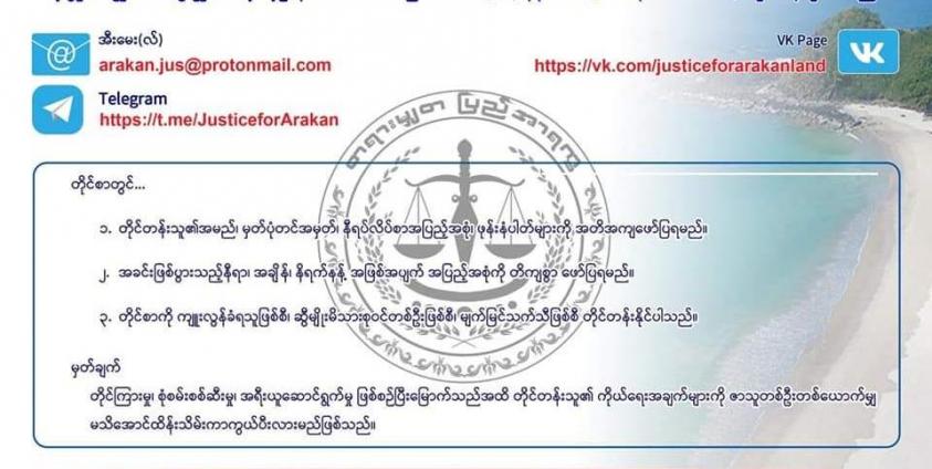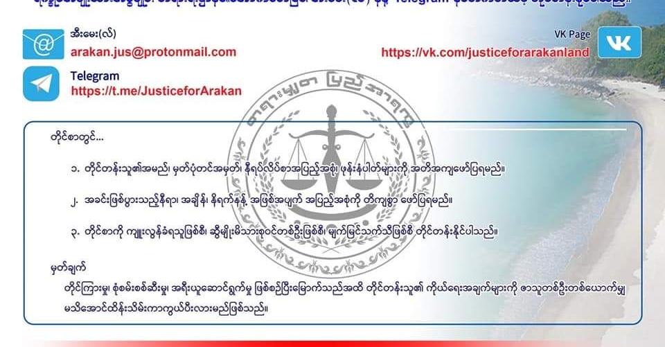 ရခိုင်တွင် နေထိုင်ကြသော ပြည်သူလူထုအနေဖြင့် ဖြစ်ပွားသောအမှုအခင်းများကို တိုင်ကြားကြားနိုင်ကြောင်း ရက္ခိုင်အမျိုးသားအဖွဲ့ချုပ် (ULA) က ယမန့်နေ့ သြဂုတ် ၁ ရက်နေ့က ထုတ်ပြန်ကြေညာသည်။
