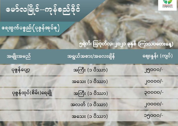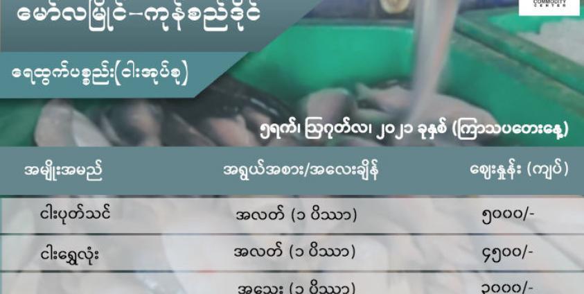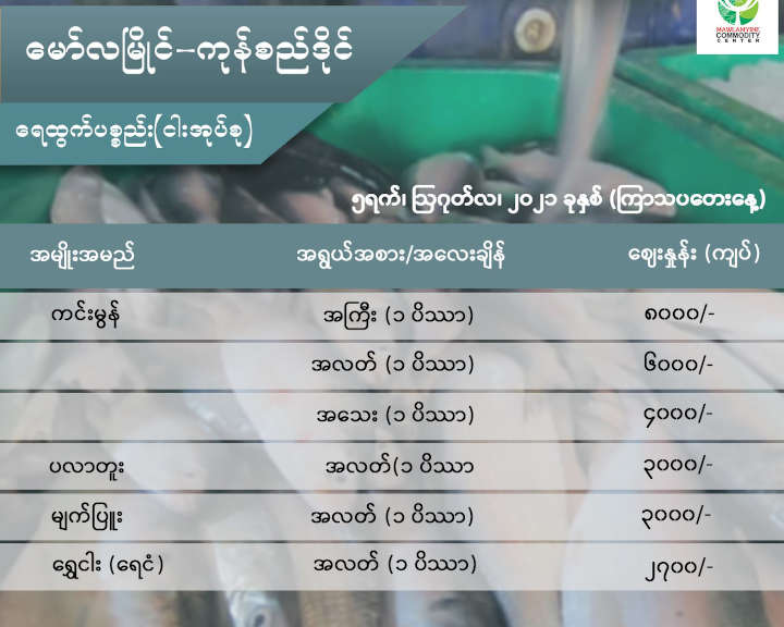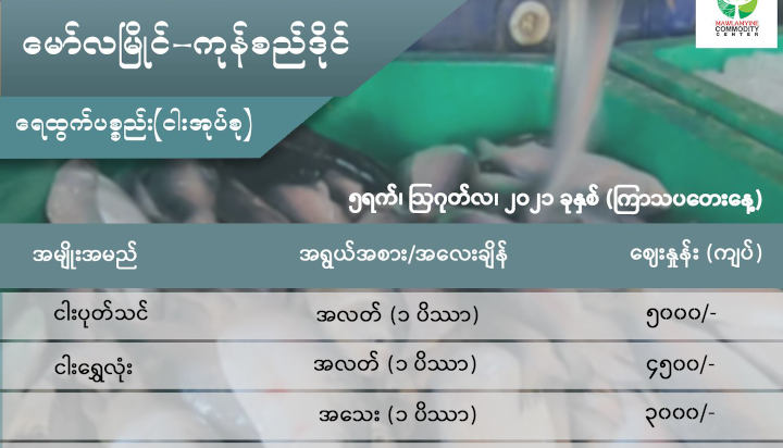 မော်လမြိုင် ကုန်စည်ဒိုင်၏ ဩဂုတ်လ ၅ ရက် ဈေးနှုန်းများအရ ငါးပုတ်သင်တစ်ပိဿာ ၅၀၀၀ ကျပ်၊ ငါးပုဏ္ဏား (ဥ) တစ်ပိဿာ ၁၁၀၀၀ ကျပ်၊ ငါးပုဏ္ဏာ (အထီး) တစ်ပိဿာ ၆၀၀၀ ကျပ်၊ ငါးကွမ်းရှပ် (အကြီး) တစ်ပိဿာ ၉၀၀၀ ကျပ်၊ (အလတ်) တစ်ပိဿာ ၇၀၀၀ ကျပ်၊ (အသေး) တစ်ပိဿာ ၆၅၀၀ ကျပ်နှင့် ငါးပျက် (အကြီး) ၄၅၀၀ ကျပ်၊ (အလတ်) ၃၀၀၀ ကျပ်၊ (အသေး) ၂၅၀၀ ကျပ် ရောင်းဈေးရှိကြောင်း သိရသည်။