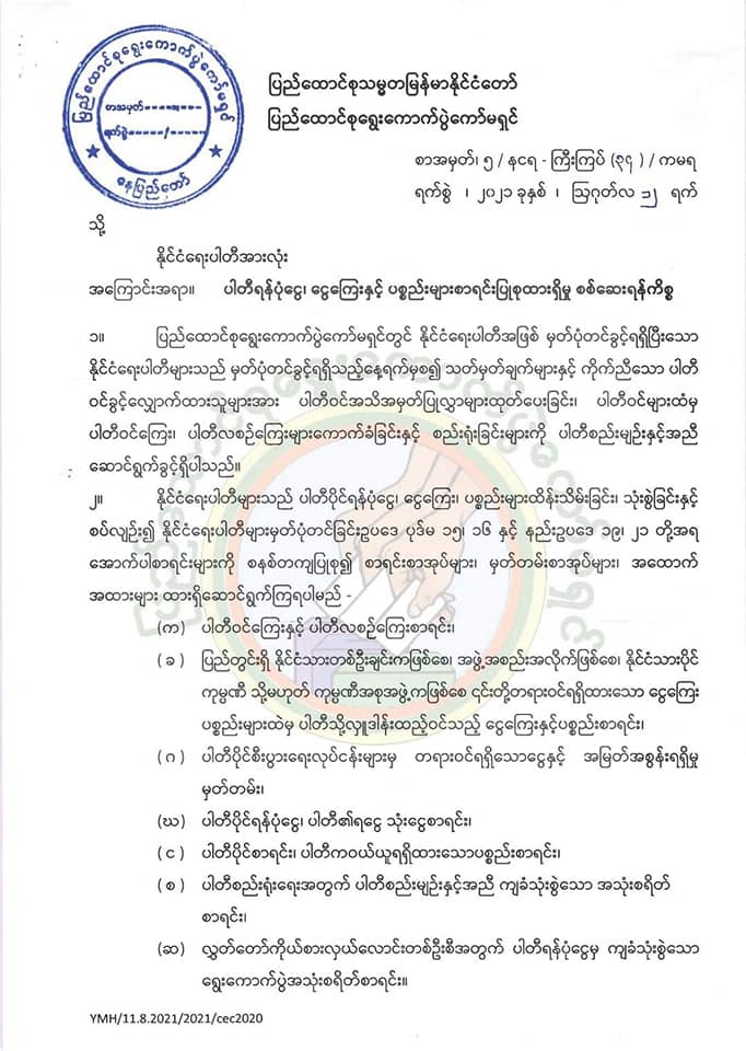 စစ်ကောင်စီကော်မရှင်ရဲ့ သြဂုတ် ၁၂ ရက်နေ့ရက်စွဲနဲ့ ထုတ်ပြန်တဲ့ အကြောင်းကြားစာမှာတော့ နိုင်ငံရေးပါတီအားလုံး ပါတီဝင်ကြေး၊ ပါတီလစဉ်ကြေး၊ ပါတီကိုလှူဒါန်းထားတဲ့ အလှူငွေစာရင်း၊ ပါတီရန်ပုံငွေနဲ့ ပါတီရငွေ သုံးငွေစာရင်းတွေကို စာရင်းပြုစုထားပေးဖို့ ဖြစ်ပါတယ်။