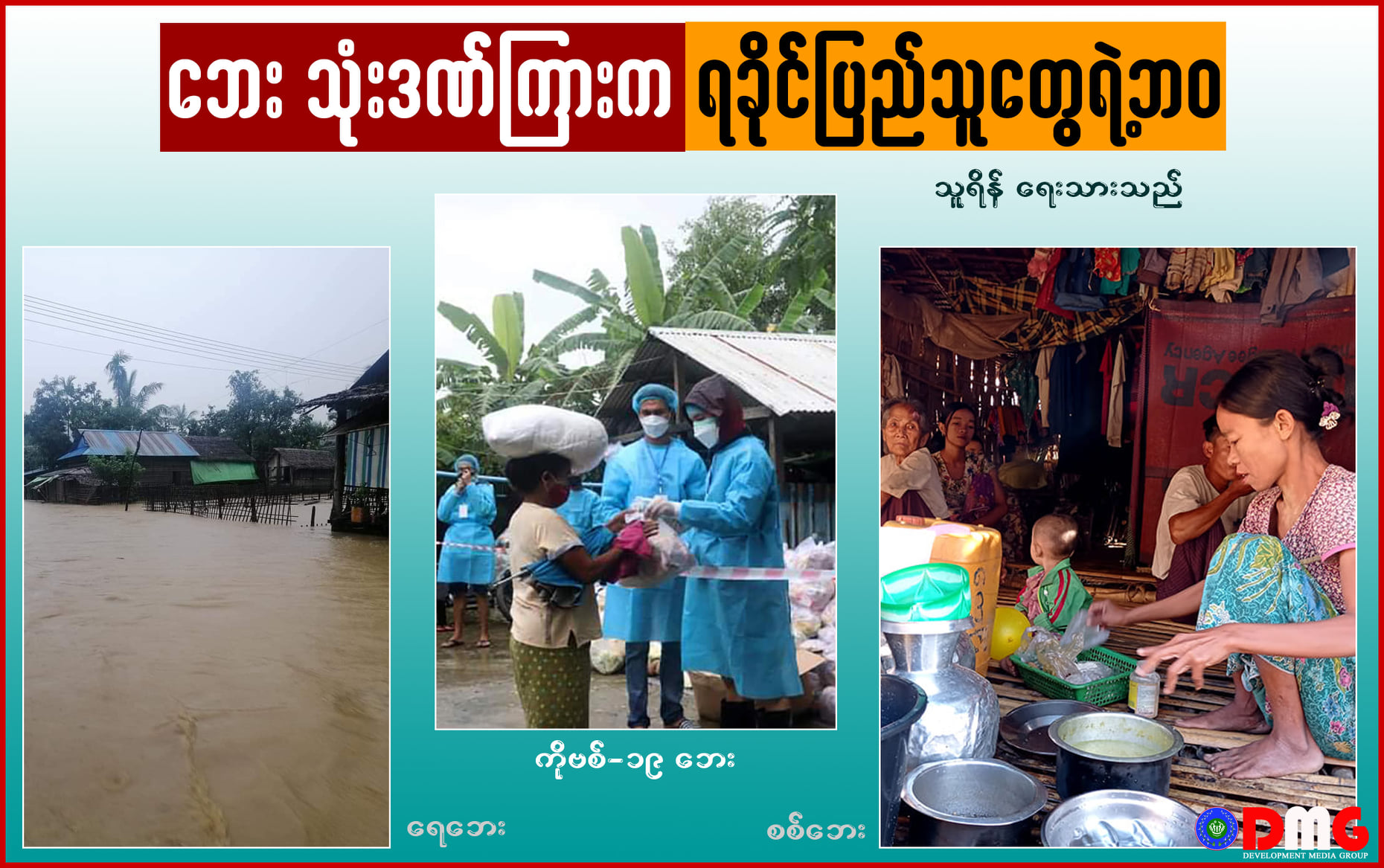 ရခိုင်ပြည်အတွင်းက ပြည်သူတွေဟာ ကိုဗစ်တတိယလှိုင်းဒဏ်ကြောင့် စီးပွားရေးနဲ့ စားဝတ်နေရေးဒဏ်ကို အလူးအလဲခံစားနေရချိန်မှာဘဲ နောက်ထပ်ဘေးဒဏ်ဆိုးတစ်ခုက ထပ်ပြီးကျရောက်လာခဲ့ပါတော့တယ်။ မိုးဦးကာလအစ ရခိုင်ပြည်မှာ မိုးရွာသွန်းမှုနည်းခဲ့ပေမယ့် မိုးလယ်ကာလမှာတော့ မိုးရွာသွန်းမှုများလာခဲ့ပြီး အဲဒီ မိုးရွာသွန်းမှုတွေနဲ့အတူ ရေကြီးရေလျံမှုဟာ နောက်ကကပ်ပြီး လိုက်ပါလာခဲ့ပါတယ်။