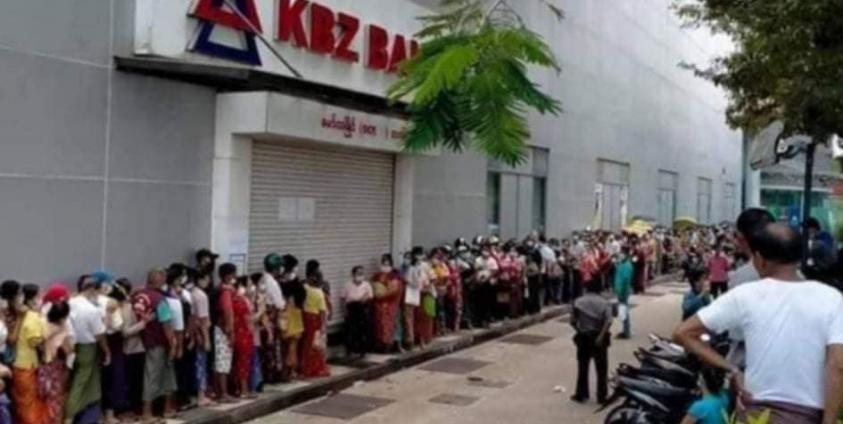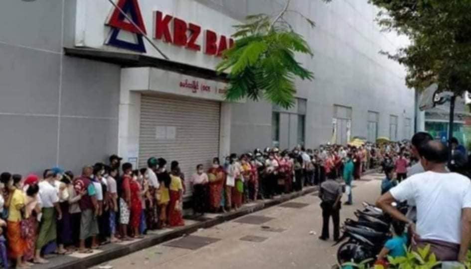 ဖေဖော်ဝါရီလ ၁ ရက်နေ့ စစ်တပ်အာဏာသိမ်းမှုနောက်ပိုင်း ငွေထုတ်သူတွေကို အလှည့်ကျတန်းစီစနစ်ဖြင့် ဘဏ်တွေက ငွေထုတ်ပေးခဲ့ပြီး၊ လက်ရှိမှာ Covid တတိယလှိုင်းကြောင့် လူစုလူဝေးမဖြစ်အောင် ဖုန်းဆက် တုံကင်ယူတဲ့စနစ်နဲ့ ငွေထုတ်ပေးနေတာ ဖြစ်ပါတယ်။