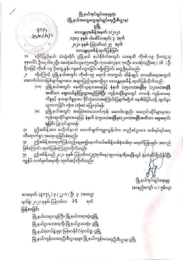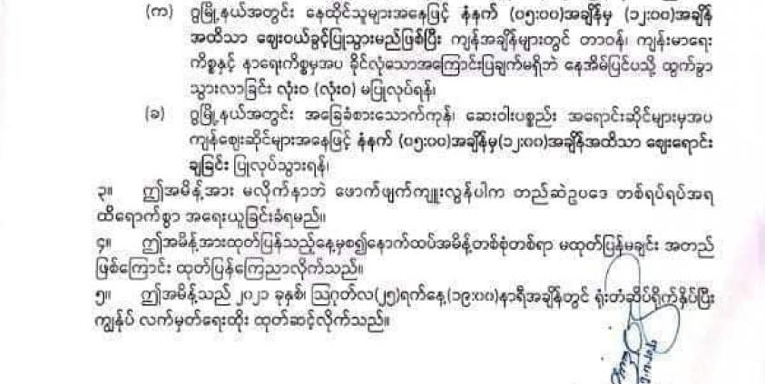 ဤအမိန့်အား မလိုက်နာဘဲ ဖောက်ဖျက်ကျူးလွန်ပါက တည်ဆဲဥပဒေ တစ်ရပ်ရပ်အရ ထိရောက်စွာ အရေးယူခြင်းခံရမည်ဟုလည်း ဆိုထားသည်။