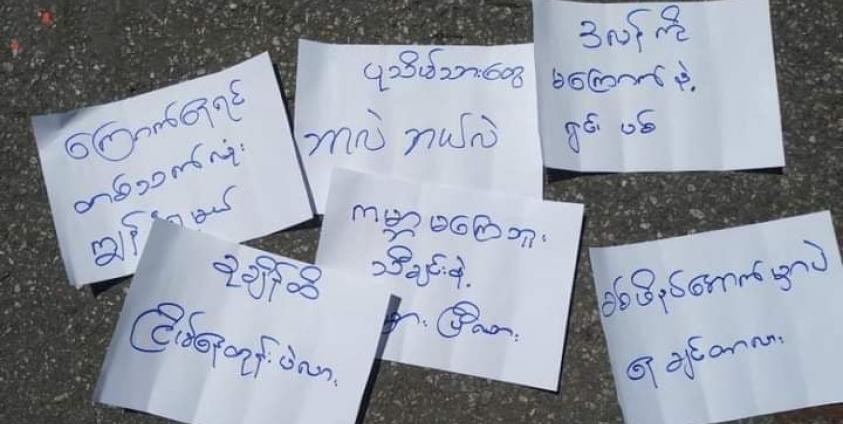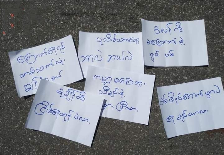 “ပုသိမ် ဘာလဲ ဘယ်လဲ၊ ဒလန်မကြောက်နဲ့ ရှင်းပစ်၊ စစ်ဖိနပ်အောက်မှာပဲ နေချင်တာလား၊ ကမ္ဘာမကျေသီချင်းနဲ့ ပြီးသွားပြီလား၊ ခုချိန်ထိ ငြိမ်နေတုန်းပဲလား၊ ကြောက်နေရင် တစ်သက်လုံးကျွန်ခံနေရမယ်” စသည့် လက်ရေးဖြင့်ရေးထားသည့် စာရွက်များကို ဖြန့်ခဲ့ခြင်းဖြစ်ကြောင်း သိရသည်။