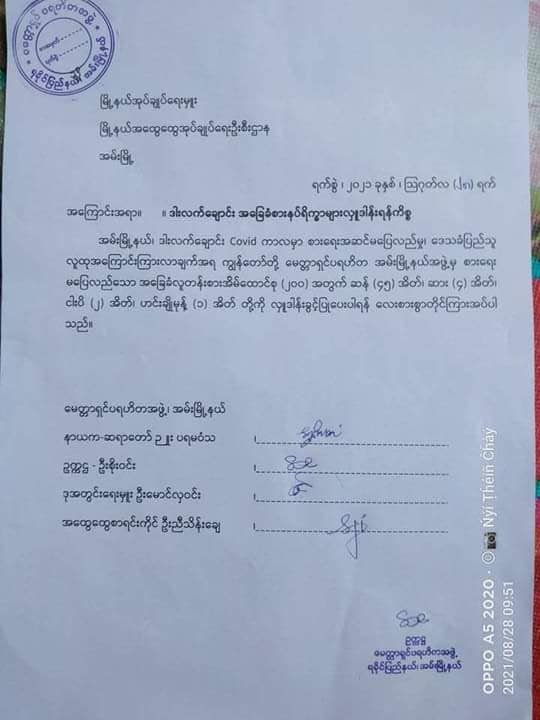 ယင်းနေ့မှစပြီး မြို့နယ်အုပ်ချုပ်ရေးမှူးထံမှ ခွင့်ပြုချက်တောင်းခံခဲ့သော်လည်း ယနေ့သြဂုတ် ၃၀ ရက်နေ့အထိ ခွင့်ပြုချက်မရသဖြင့် ထောက်ပံ့မည့်အစီအစဉ်အား ရပ်နားလိုက်ရခြင်းဖြစ်သည်ဟု မေတ္တာရှင်ပရဟိတအဖွဲ့ ဥက္ကဋ္ဌ ကိုစိုးဝင်းက DMG ကိုပြောသည်။