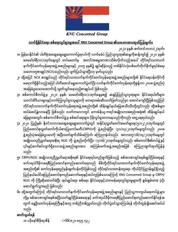 ပြည်ထောင်စုလွှတ်တော်ကိုယ်စားပြုကော်မတီ (CRPH) နှင့် အမျိုးသားညီညွတ်ရေးအစိုးရ (NUG) ၏ နိုင်ငံရေးရပ်တည်ချက်သည် မိမိတို့၏ ရပ်တည်ချက်နှင့် ထပ်တူကျသောကြောင့် ၎င်းတို့ကို ကြိုဆိုထောက်ခံကြောင်း KNU Concerned Group က စက်တင်ဘာလ ၂ ရက်နေ့တွင် သဘောထားထုတ်ပြန်ကြေညာခဲ့သည်။