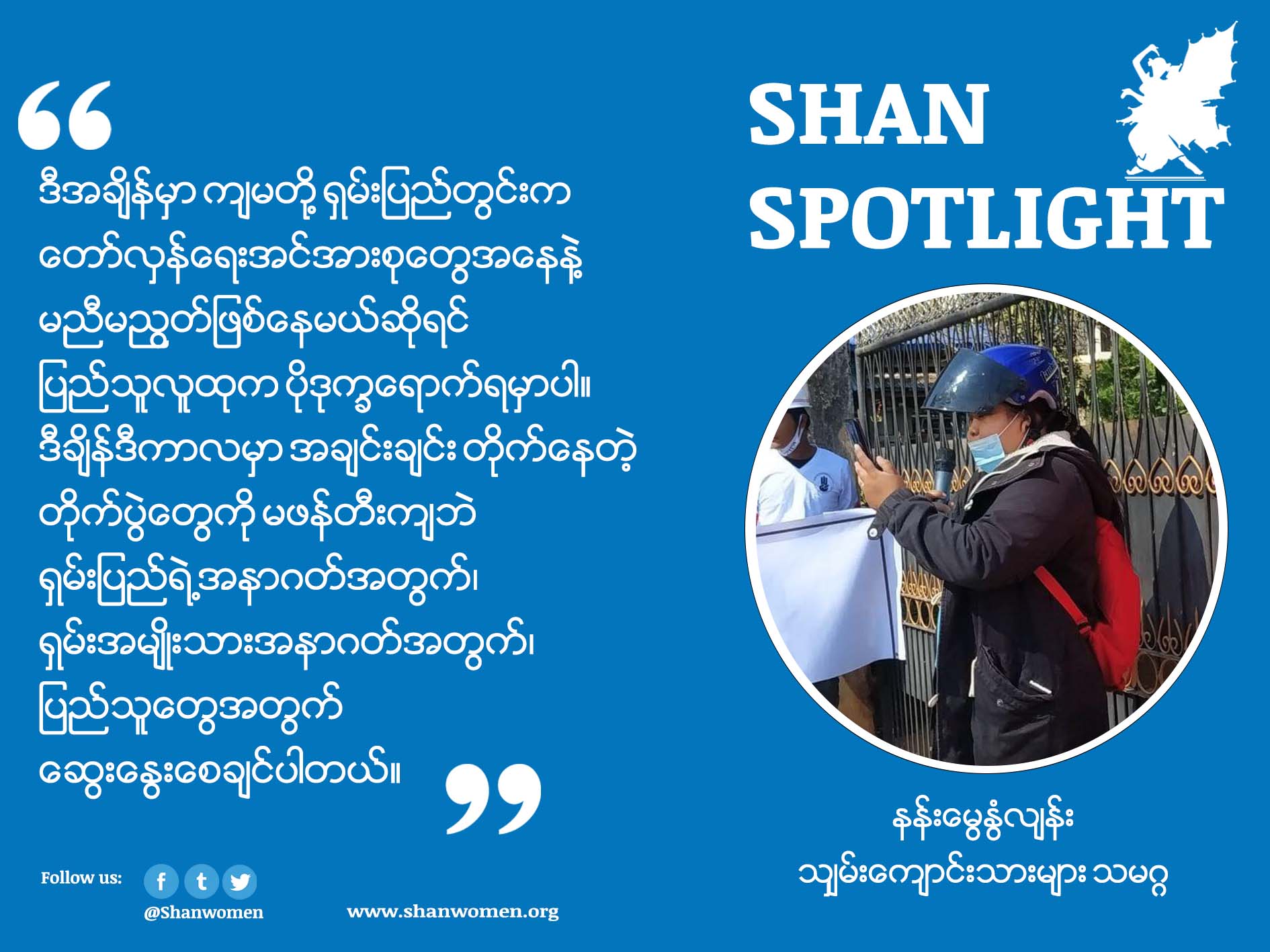 အီဂျစ်ဒီမိုကရေစီလှုပ်ရှားမှုခေါင်းဆောင် ဝေးဂိုနင်က “The power of the people is much stronger than the people in power” “ပြည်သူ့အာဏာ၊ ပြည်သူ့အင်အားဟာ အာဏာရှိသူတွေရဲ့ အာဏာ၊ အင်အားတွေထက် အများကြီး အားကောင်းပါတယ်” လို့ဆိုခဲ့သလို သူမအနေနဲ့လည်း စစ်အာဏာရှင် ဆန့်ကျင်ရေး၊ အမျိုသားတန်းတူရေးတိုက်ပွဲတွေကို လူငယ်ထုတွေရဲ့အင်အား၊ တော်လှန်ရေးတပ်ဖွဲ့တွေ ရဲ့အင်အားနဲ့ချည်းဘဲ တိုက်လို့မရပါဘူး။ ရှမ်းပြည်သူလူထုတစ်ရပ်လုံး အင်တိုက်အားတိုက်ပါဝင်မှသာ ကျမတို့အောင်မြင်နိုင်မှာပါ။ ဒါ့ကြောင့် အားလုံးလက်တွဲပါဝင်ပေးကြဖို့ နန်းမွေနွံလျန်းက တိုက်တွန်း လိုက်ပါတယ်။