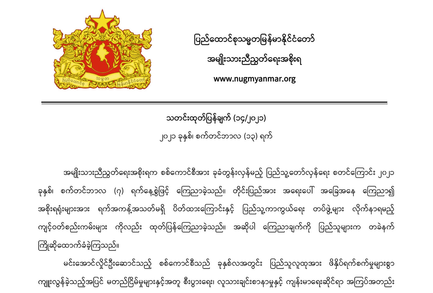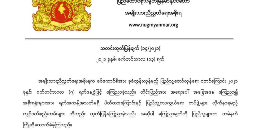 ထို့ကြောင့် စစ်ကောင်စီအား အမြစ်ပြတ် ခုခံတွန်းလှန်သွားရန်နှင့် ပြည်သူလူထုအားလုံး၏ ညီမျှမှု၊ လွတ်လပ်မှု၊ အားလုံးပါဝင်မှုနှင့် ဒီမိုကရေစီ အခွင့်အရေးများအား အပြည့်အ၀ ကာကွယ်စောင့်ရှောက်ပေးမည့် ငြိမ်းချမ်းသော ဖက်ဒရယ်ဒီမိုကရေစီ ပြည်ထောင်စုတည်ဆောက်ရန်အတွက် ပြည်သူတရပ်လုံးက စည်းလုံးညီညွတ်စွာဖြင့် အမျိုးသားညီညွတ်ရေးအစိုးရနှင့် ပူးပေါင်းဆောင်ရွက်ရန် NUG က တိုက်တွန်းထားသည်။