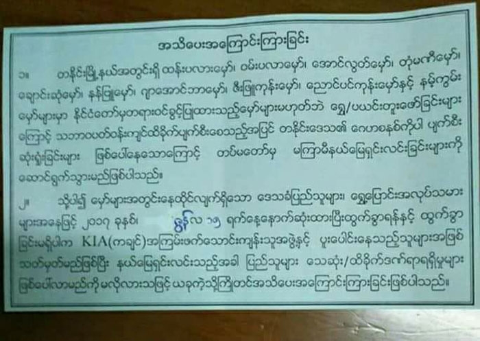 နယ်မြေရှင်းလင်းရေးတွင် ပြည်သူလူထုုအား ထိခုုိက်သေဆုံုးမှု မရှိစေရန် အမြန်ဆုံုးထွက်ခွာသွားရန်နှင့် ထွက်ခွာခြင်း မရှိပါကKIA နှင့် ဆက်သွယ်သူများဖြစ်သည်ဟုု သတ်မှတ်မည်ဟုု စာတွင် ရေးသားထားသည်ဟုု သူက ပြောသည်။