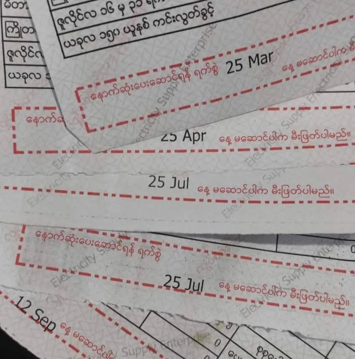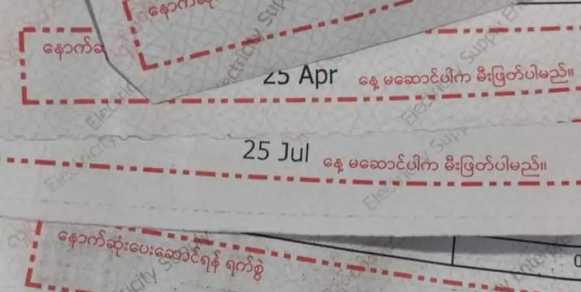 မီတာခတွေကို သက်ဆိုင်ရာ မြို့နယ်ရုံးတွေမှာ သွားရောက် အခွန်ဆောင်ကြဖို့နဲ့ သတ်မှတ်ရက်အတွင်း မီတာခ မဆောင်ရင် မီးဖြတ်မယ်လို့ ခြိမ်းခြောက်လာနေတာပါ။
