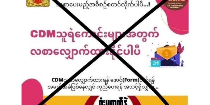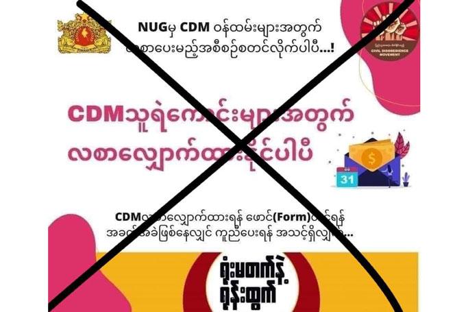 ပြီးခဲ့တဲ့ ရက်ပိုင်းအတွင်း NUG ကနေပြီး CDM ဝန်ထမ်းတွေကို လစာပေးတော့မယ်။ လာဆက်သွယ်ပါဆိုပြီး လူမှုကွန်ယက်မှာ ပိုစ့်တွေ ပြန့်နှံ့ခဲ့ပါတယ်။