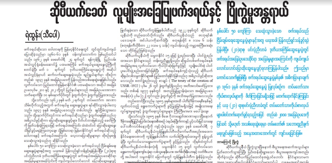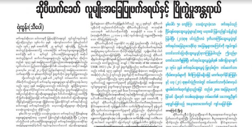 ရဲထွန်း(သီပေါ) ရဲ့ “ဆိုဗီယက်ခေတ် လူမျိုးအခြေပြု ဖက်ဒရယ်နှင့် ပြိုကွဲမှုအန္တရာယ်” ---ဆိုတဲ့ ဆောင်းပါးမျိုးဖြစ်ပါတယ်။ ဒီလို ဆောင်းပါးတွေ ဆက်တိုက် ဖော်ပြလာလိမ့်မယ်လို့ ထင်ပါတယ်။ ဘာကြောင့်လဲဆိုတော့ “သက်ဆိုင်ရာ ဆောင်းပါးရှင်ရဲ့ အာ ဘော်ပါလို့ မည်သို့ပင်ဆိုနေစေကာမူ” အစိုးရပိုင်သတင်းစာက အရေးတယူဖော်ပြတယ်ဆိုတာ အစိုးရအာဘော်နဲ့နီးစပ်လို့၊ အစိုး ရက သဘောတူ၊ အစိုးရက နှစ်ခြိုက်လို့ဖော်ပြတာပဲ မဟုတ်ပါလား။