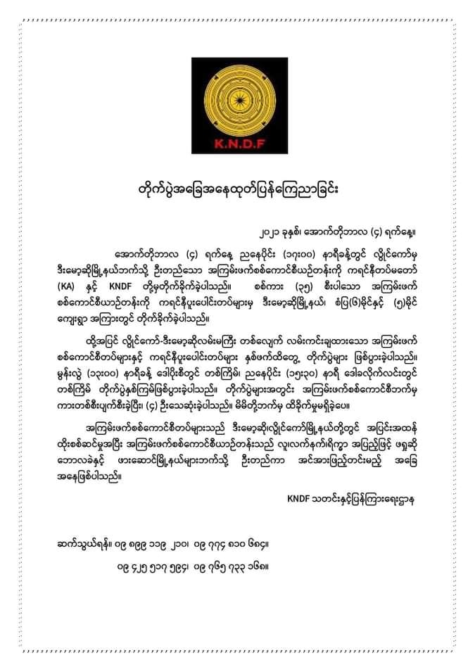 ဒီကနေ့ (အောက်တိုဘာ ၄ ရက်) မှာ အကြမ်းဖက်စစ်ကောင်စီနဲ့ ကရင်နီတပ်မတော် KA နဲ့ KNDF ပူးပေါင်းတပ်ဖွဲ့တို့ သုံးကြိမ်တိုက်ပွဲဖြစ်ပွားခဲ့တယ်လို့ KNDF က ထုတ်ပြန်ချက်အရ သိရပါတယ်။