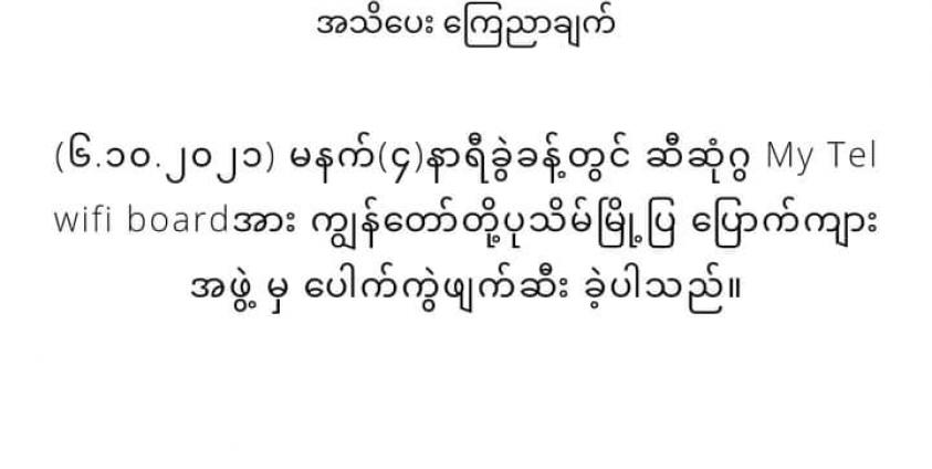 အမှတ် ၁၃ ရပ်ကွက်၊ ငါးကျီးထူရပ်တွင်စိုက်ထူထားသော တာဝါတိုင်ရှိ ဆက်စပ်ပစ္စည်းဖြစ်သည့် ဝိုင်ဖိုင် (Wifi) ပုံးတစ်ပုံး မိုင်းခွဲဖျက်ဆီးခံရပြီး လူထိခိုက်မှုမရှိဟု ဒေသခံများက ပြောသည်။