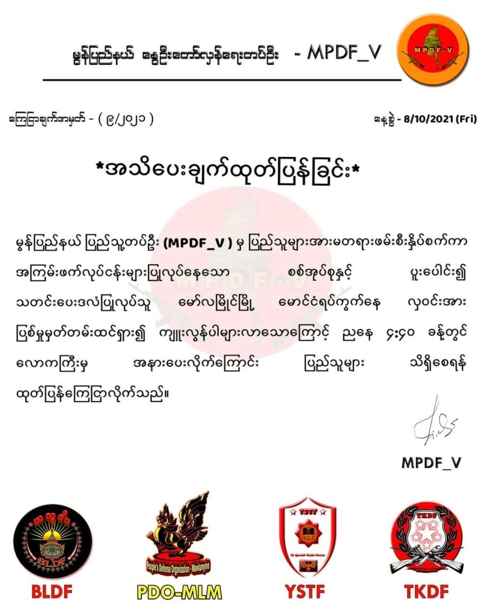 လက်ရှိ ပစ်သတ်မှုနဲ့ပတ်သက်ပြီး ပြည်သူတွေကို မတရားဖမ်းဆီးနှိပ်စက်ကာ အကြမ်းဖက်လုပ်ငန်းများ ပြုလုပ်နေတဲ့ စစ်အုပ်စုနဲ့ပူးပေါင်းပြီး သတင်းပေး လံပြုလုပ်နေတဲ့ မော်လမြိုင်မြို့ မောင်ငံရပ်ကွက်နေ ဦးလှဝင်းကို လောကကြီးမှ အနားပေးလိုက်ကြောင်း မွန်ပြည်နယ် နွေဦးတော်လှန်ရေးတပ်ဦးက ထုတ်ပြန်ထားပါတယ်။