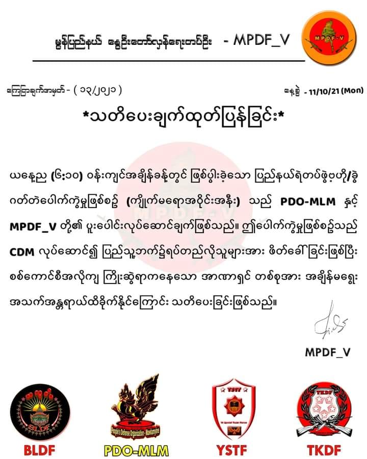အဲဒီဗုံးပေါက်ကွဲမှုကို မွန်ပြည်နယ် နွေဦးတော်လှန်ရေးတပ်ဦး (MPDF-V) က PDO-MLM နဲ့ ပူးပေါင်းလုပ်ဆောင်တာဖြစ်တယ်လို့ ထုတ်ပြန်ပါတယ်။