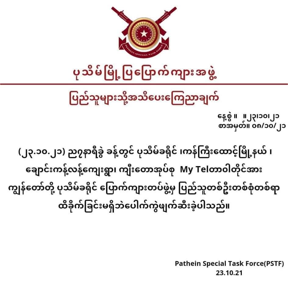 ဧရာဝတီတိုင်းတွင် စက်တင်ဘာလမှစတင်၍ ဘိုကလေး၊ မအူပင်၊ ကျိုက်လတ်၊ မော်လမြိုင်ကျွန်း၊ ပုသိမ်၊ ကန်ကြီးထောင့်နှင့် ဖျာပုံမြို့နယ်များ အပါအဝင် အခြားသောမြို့နယ်များရှိ Mytel ဖုန်းတာဝါတိုင် ၁၀ တိုင် မိုင်းခွဲမီးရှို့ ဖျက်ဆီးခံထားရပြီဖြစ်သည်။