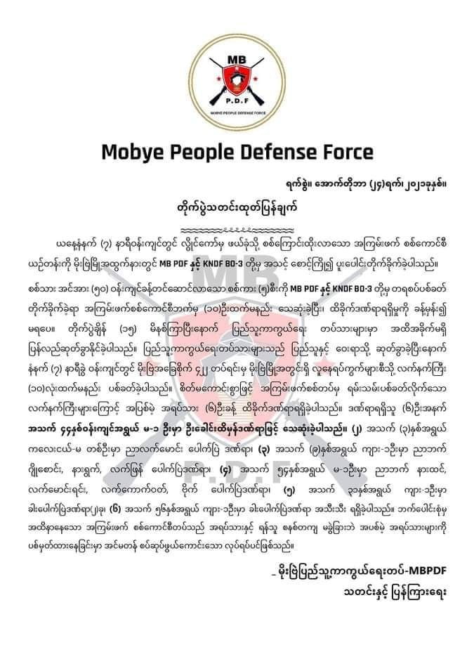 လွိုင်ကော်မှ ဖယ်ခုံကို စစ်ကြောင်းထိုးလာတဲ့ အကြမ်းဖက်စစ်ကောင်စီယာဉ်တန်းကို မိုးဗြဲမြို့အထွက်နားမှာ မိုးဗြဲ PDF နဲ့ KNDF ပူးပေါင်းတပ်တို့ တိုက်ခိုက်ခဲ့ပြီး စစ်ကောင်စီတပ်သား (၁၀) ဦးထက်မနည်းသေဆုံးပြီး ထိခိုက်ဒဏ်ရာရရှိခဲ့တယ်လို့ ဒီကနေ့ အောက်တိုဘာလ ၂၄ ရက်နေ့မှာ မိုးဗြဲပြည်သူ့ကာကွယ်ရေး သတင်းနှင့်ပြန်ကြားရေးက ထုတ်ပြန်ပါတယ်။