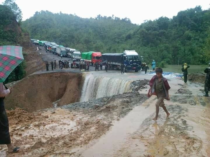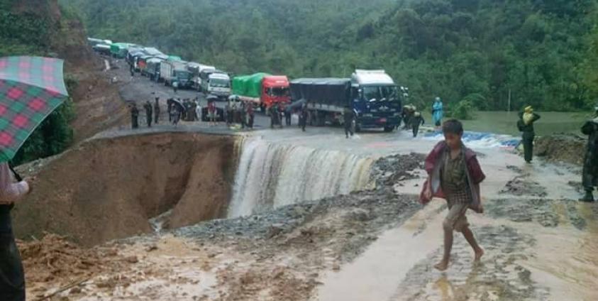 လွန်ခဲ့သော တစ်ရက် နှစ်ရက်အတွင်း မိုးအဆက်မပြတ် ရွာသွန်းပြီးနောက် ရေကြီး ရေလျှံဖြစ်ကာ ရန်ကုန်-စစ်တွေ ကားလမ်းမကြီးမှာ အမ်းမှ စစ်တွေဘက်သို့ အလာ ၂၈ မိုင်ခန့် အကွာတွင် ဇွန်လ ၁၄ ရက်နေ့ နံနက်ပိုင်းက ပျက်စီးသွားခဲ့သည်ဟု အမ်းမြို့နယ် ရဲစခန်း တာဝန်ရှိသူ တစ်ဦးက ပြောသည်။