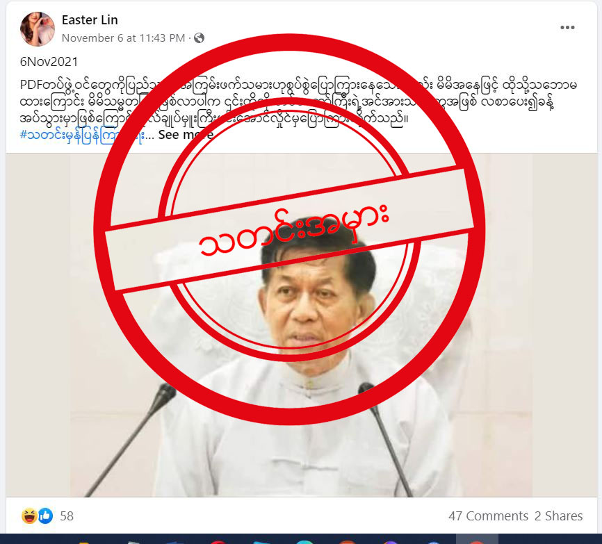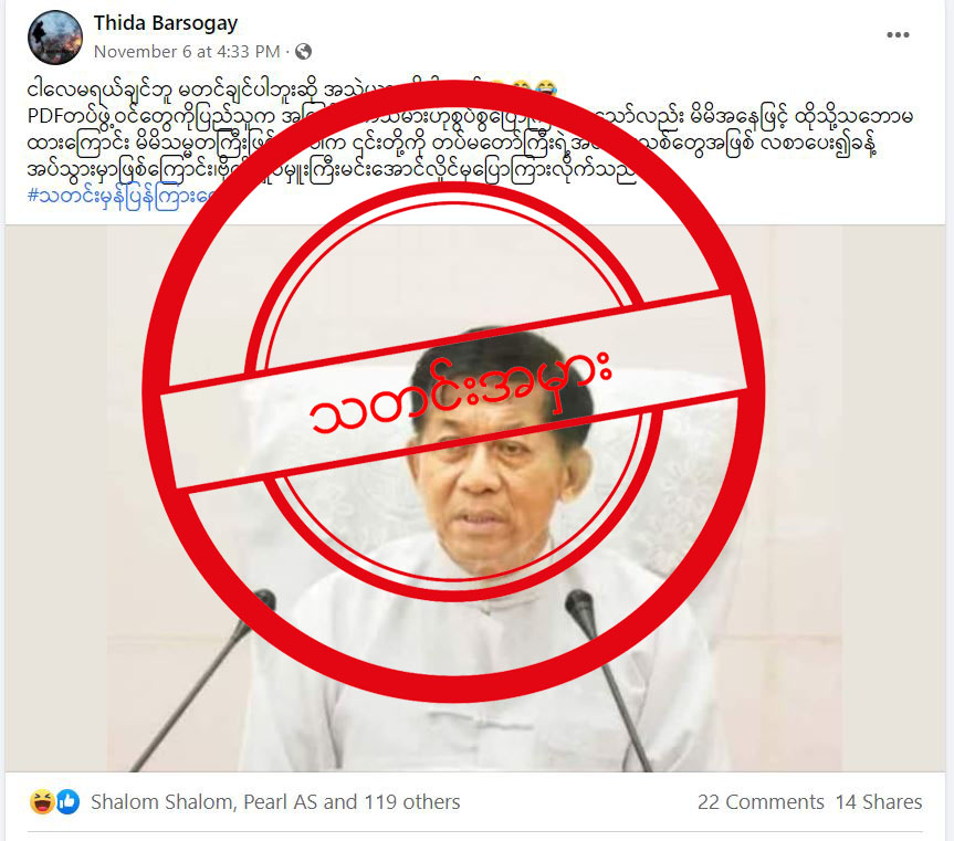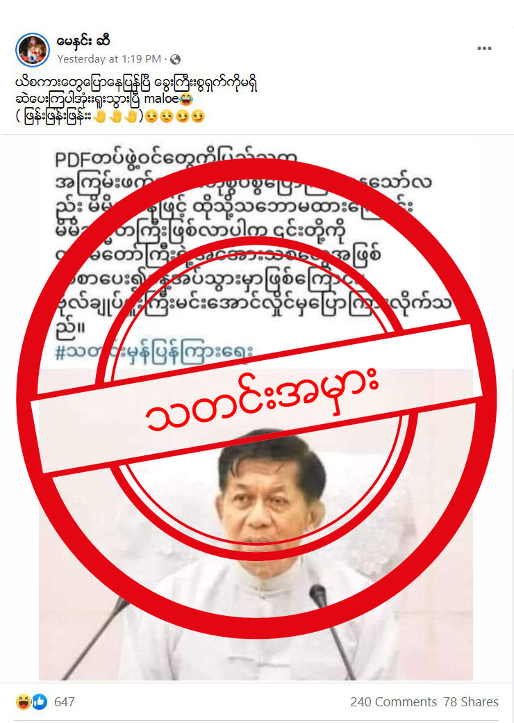 “PDF တပ်ဖွဲ့ဝင်တွေကို ပြည်သူက အကြမ်းဖမ်းသမားဟု စွပ်စွဲပြောကြားနေသော်လည်း မိမိ အနေဖြင့် ထိုသို့ သဘောမထားကြောင်း မိမိသမ္မတကြီး ဖြစ်လာပါက ၎င်းတို့ကို တပ်မတော်ကြီးရဲ့ အင်အားသစ်တွေအဖြစ် လစာပေး၍ ခန့်အပ်သွားမှာဖြစ်ကြောင်း ဗိုလ်ချုပ်မှူးကြီး မင်းအောင်လှိုင်မှ ပြောကြားလိုက်သည်” (Easter Lin မူရင်းအရေးအသားအတိုင်းဖြစ်သည် လို့ ရေးသားထားပြီး အဆုံးမှာ “#သတင်းမှန်ပြန်ကြားရေး” ဆိုပြီး အဆုံး သတ်ထားပါတယ်။