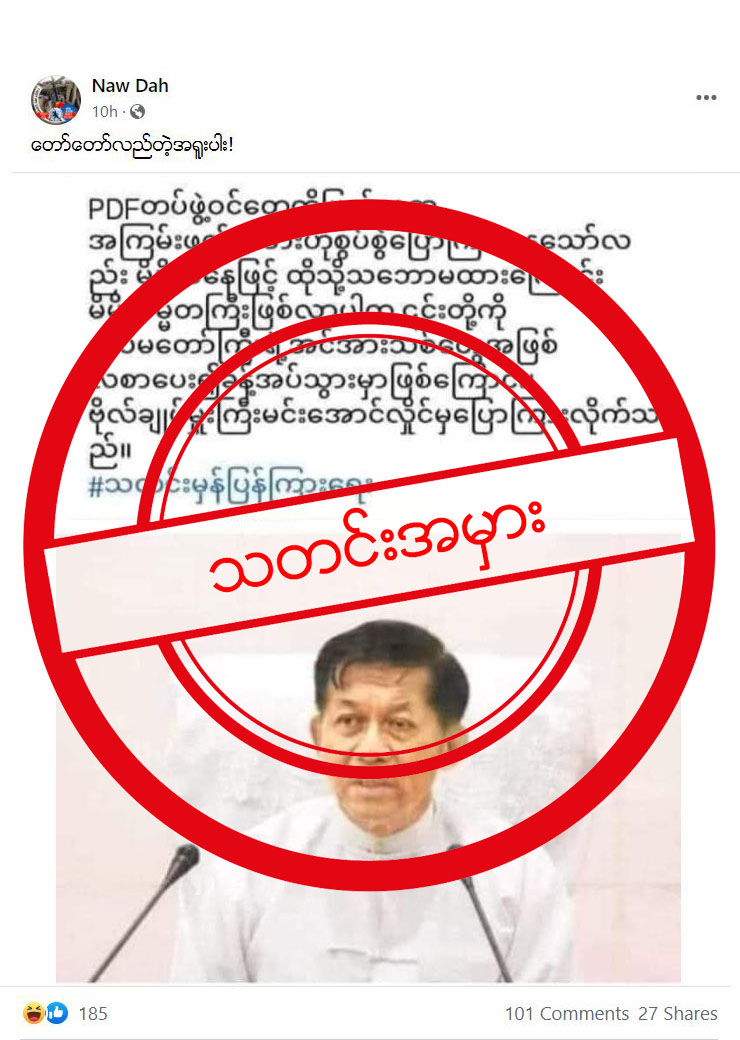 ပြည်သူ့ကာကွယ်ရေးတပ် PDF တွေကို အကြမ်းဖက်သမားများဟု သဘောမထားပဲ တပ်မတော်၏ အင်အားသစ် တွေအဖြစ် လစာပေးကာ ခန့်အပ်သွားမယ်လို့ ဗိုလ်ချုပ်မှူးကြီး မင်းအောင်လှိုင်က ပြောကြားလိုက်တယ်ဆိုတဲ့ သတင်းအမှား တစ်ခုဟာ Facebook လူမှုကွန်ရက် စာမျက်နှာမှာ ပြန့်နှံနေပါတယ်။