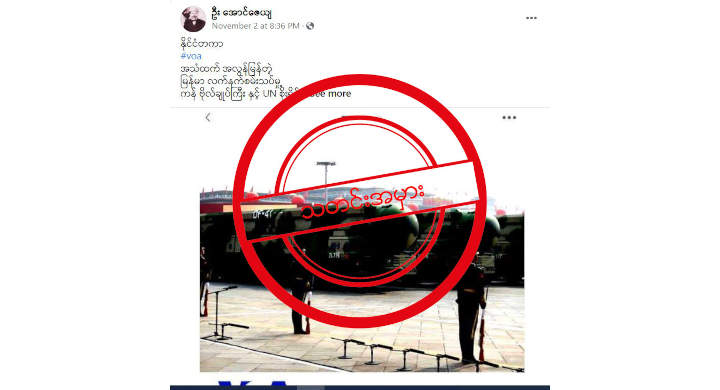 အသံထက် ပိုမြန်တဲ့ မြန်မာ လက်နက်စမ်းသပ်မှု ကန် ဗိုလ်ချုပ်ကြီး နှင့် UN စိုးရိမ် ဆိုတဲ့သတင်းအမှား တစ် ပုဒ်ကို အောက်တိုဘာလ ၂၉ ရက်က Kyaw Thiha ဆိုတဲ့ အကောင့်ပိုင်ရှင်က USDP {ပြည်ခိုင်ဖြိုး}တပ်မတော်၊ ရဲ ချစ်မြတ်နိုးသူများ စုစည်းရာ Facebook Group ထဲမှာ ရေးတင်ထားကို တွေ့ရပါတယ်။