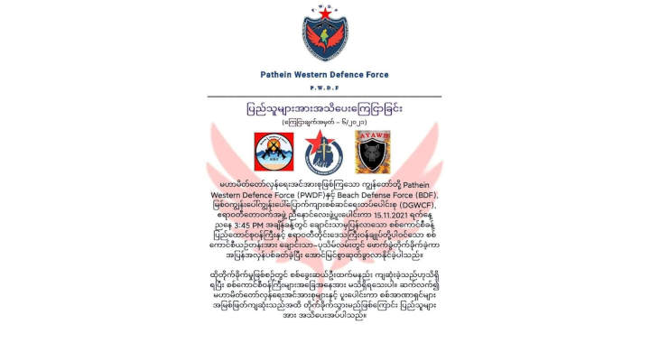 နိုဝင်ဘာလ ၁၅ ရက်နေ့က ဖြစ်ပွားခဲ့သည့် ယာဉ်တန်းတိုက်ခိုက်ခံရမှုသည် ဒေသအတွင်းရှိ PDF ညီ နောင်လေးဖွဲ့က ပူးပေါင်းတိုက်ခိုက်ခဲ့ခြင်းဖြစ်သည်ဟု ပုသိမ် အနောက် ပြည်သူ့ကာကွယ်ရေး တပ်ဖွဲ့ PWDF ကသတင်းထုတ်ပြန်သည်။