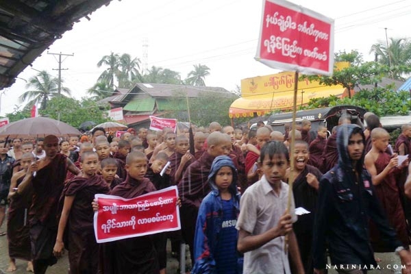 ဆန္ဒပြပွဲတွင် (၁) ငြိမ်းချမ်းရေး ရခိုင်ပြည်ကြီးငြိမ်းချမ်းရေး၊ (၂) ငြိမ်းချမ်းရေး ပြည်ထောင်စုကြီးငြိမ်းချမ်းရေး၊ (၃) ရခိုင်တွေပိုင်တဲ့ ရခိုင်မြေ ဘင်္ဂလီအထုပ် လာမရှုပ်နဲ့၊ (၄) ရေမျှောကမ်းတင်ဘင်္ဂလီများ ရခိုင်လူမျိုးနဲ့ လုံးဝမဆိုင်ဘူး၊ (၅) ပြည်တွင်းခိုးဝင် ဘင်္ဂလီအရေး ပြည်ထောင်စုကပြတ်သားပါ၊ (၆) ရခိုင်ပြည်က ပြဿနာ ပြည်ထောင်စုမှာ တာဝန်မရှိဘူးလား၊ (၇) ဘင်္ဂလီကိစ္စဖြစ်တိုင်းမှာ ရခိုင်ပြည်ကို ပုံမချနဲ့၊ (၈) INGO/NGO အမှန်တရားကို လေးစားပါ၊ (၉) ပြည်တွင်းပြည်ပ မီဒီယာ အမှန်တရားကို ဖေါ်ပြပါ၊ (၁၀) အမျိုး ဘာသာ ပြည်စောင့်ထား၊ ရခိုင်သားကို လာမစမ်းနဲ့ စသည့်ကြွေးကြော်သံများဖြင့် ချီတက် ဆန္ဒပြခဲ့ကြပြီး စစ်တွေမြို့နှင့် ရခိုင်ပြည်နယ်အနှံ့ ဆန္ဒပြပွဲများသို့ ဦးပါမောက္ခနှင့် ဦးဝီရသူတို့ထံမှ သဝဏ်လွှာများ ပေးပို့ခဲ့ကြောင်း သိရသည်။