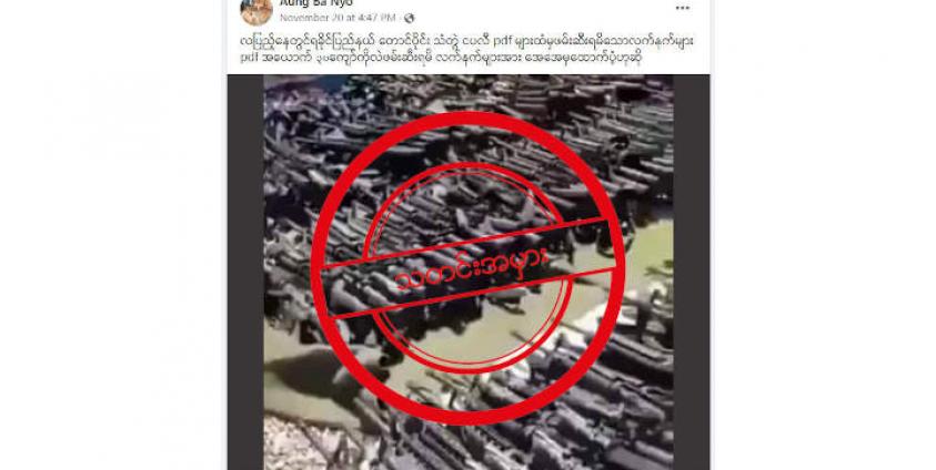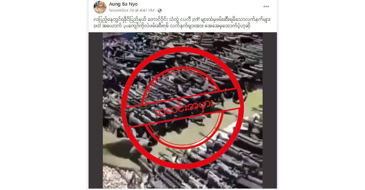 ရခိုင်ပြည်နယ် တောင်ပိုင်း သံတွဲ ငပလီ PDF အယောက် ၃၀ ကို လပြည့်နေ့က AA က ထောက်ပံ့ထားတဲ့ လက်နက်ခဲယမ်းတွေနဲ့ အတူ ဖမ်းဆီးရမိတယ်ဆိုတဲ့ သတင်းတစ်ခုကို Aung Ba Nyo ဆိုသူ Facebook Account ပိုင်ရှင်က သိမ်းဆည်းရမိထားတယ်လို့ဆိုတဲ့ လက်နက်ဓာတ်ပုံနဲ့တကွ နိုဝင်ဘာလ ၂၀ ရက်နေ့က ရေးတင်ထားပါတယ်။