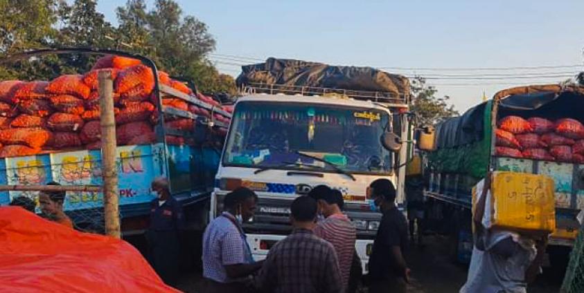 မောင်တောဝင်/ထွက်စခန်း POE ဘုတ်ဆိတ်တွင် ကုန်များသောင်တင်နေပြီး ကုန်တင်ကားများလည်း ပိတ်ဆို့လျှက်ရှိနေသည်။